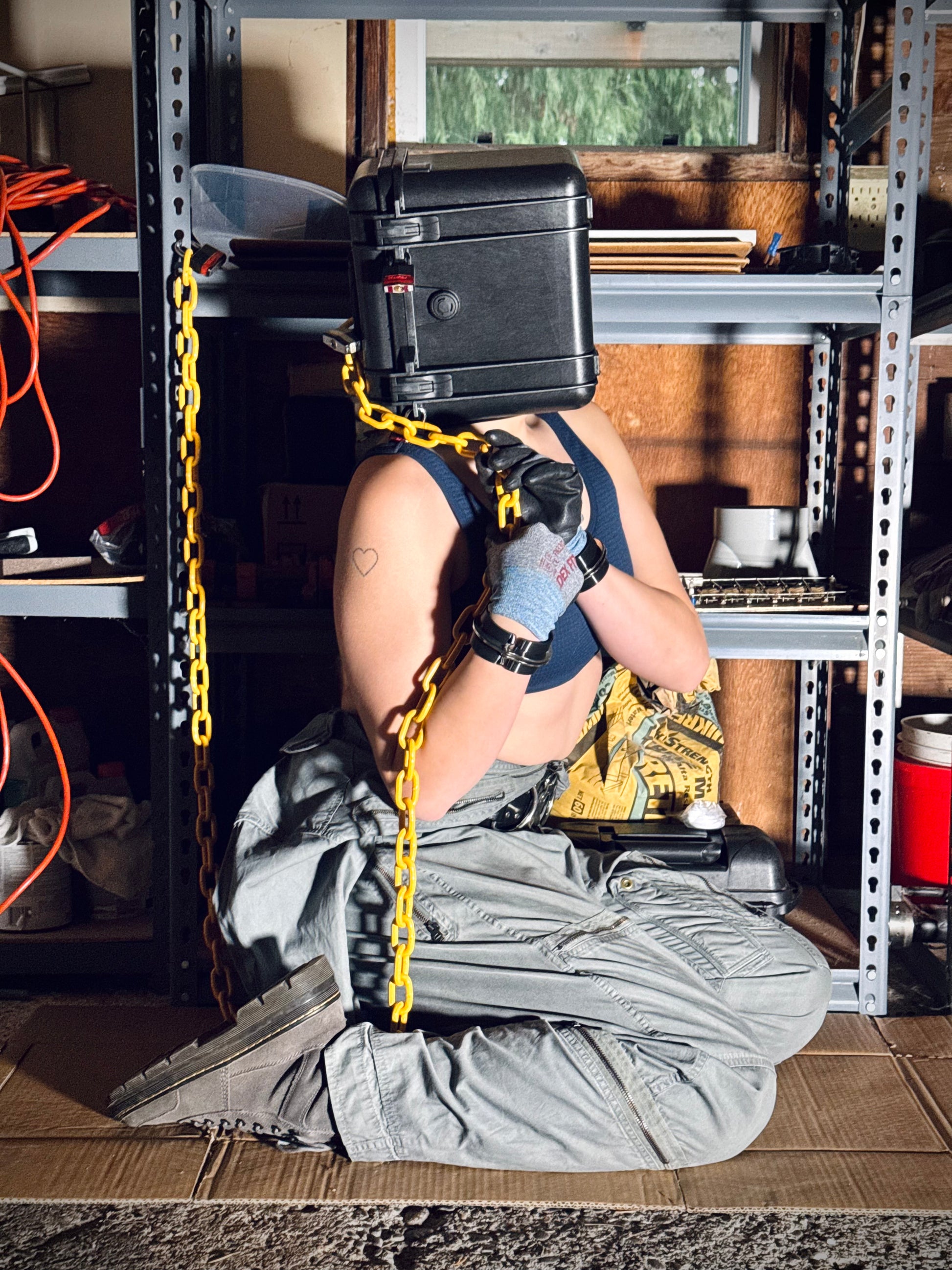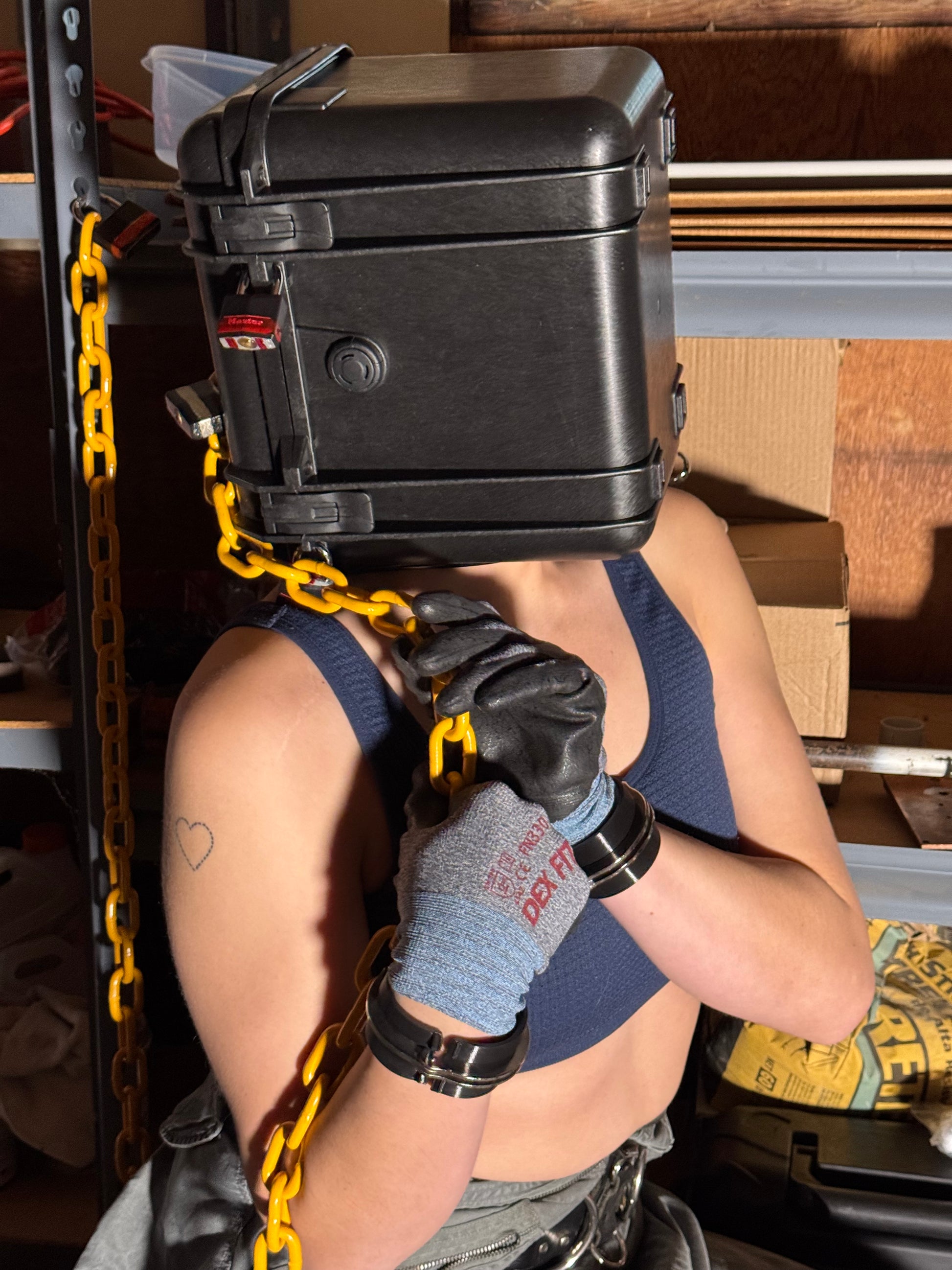 Hard case converted into a locking, padded leather lined sensory deprivation hood. Breathable but intense piece of gear. Has an integrated folding handle on the back.