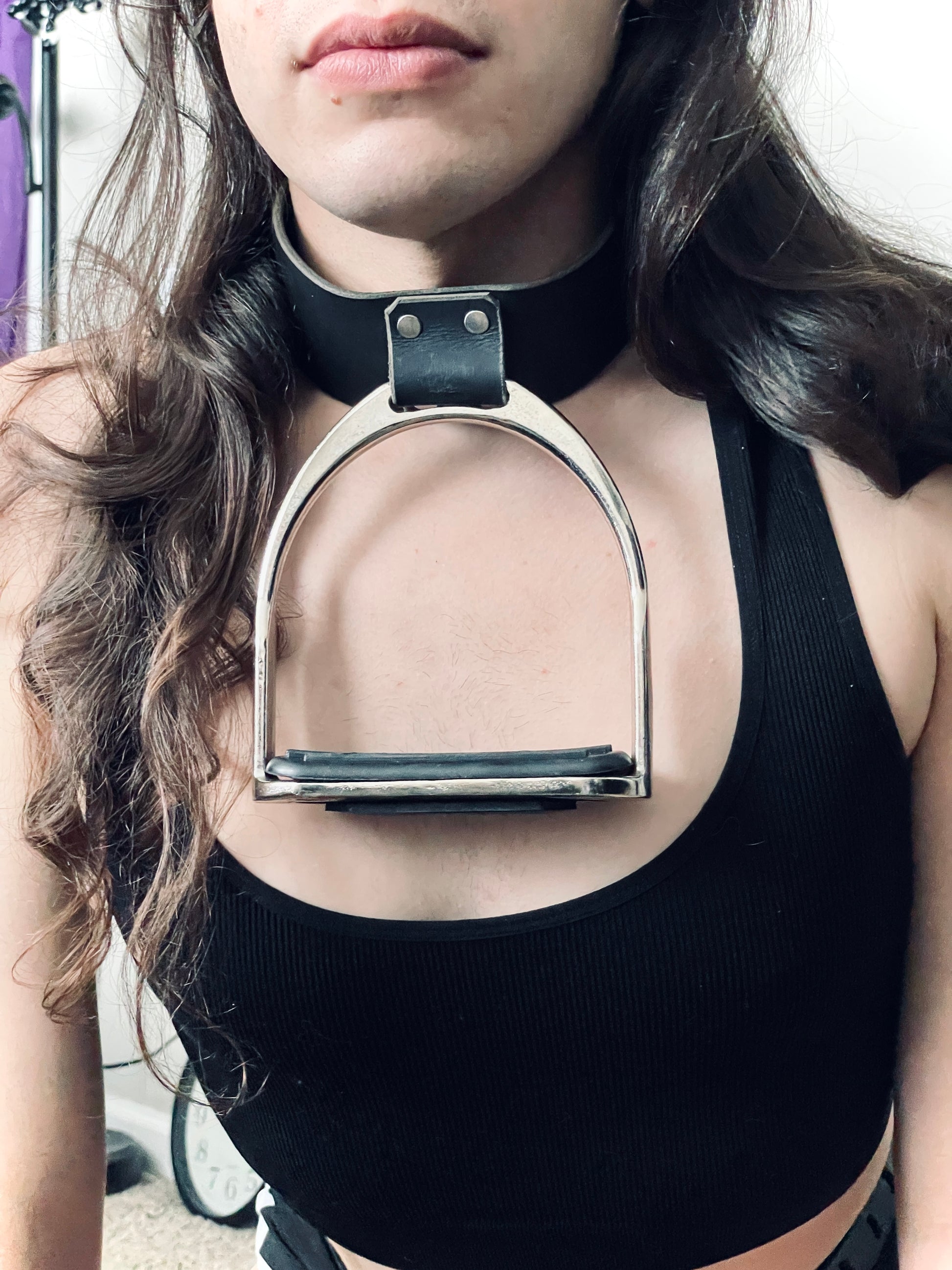 This stainless steel stirrup collar is constructed with thick leather and stainless steel hardware. The stirrup itself has a removable rubber pad for easy cleaning.